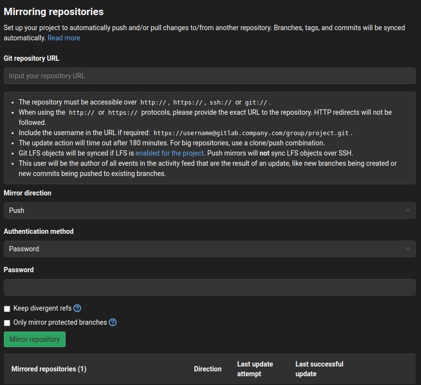 - Gitlab에 Settings - Repository - Mirroring repositories에 가면 Git repository URL을 등록 할 수 있다. 생성한 Github의 https 주소를 적는다. 여기서 주의해야 할 점이 github.com 앞에 나의 Github 계정을 적어야 한다는 것이다. e.g.) id@github.com/id/repo.git Mirror direction은 Pull로 하고 Authentication method는 Password로 한다. 여기에는 아까 만든 토큰을 적으면 된다. 그리고 생성하면 Github에서 Gitlab으로 pull 할 수 있는 Mirror repo가 생성된다.