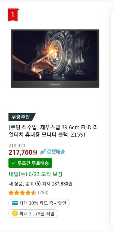 터치, 15.6인치, 밝기250 이 스펙에 13.7만원이면 나쁘지 않다.