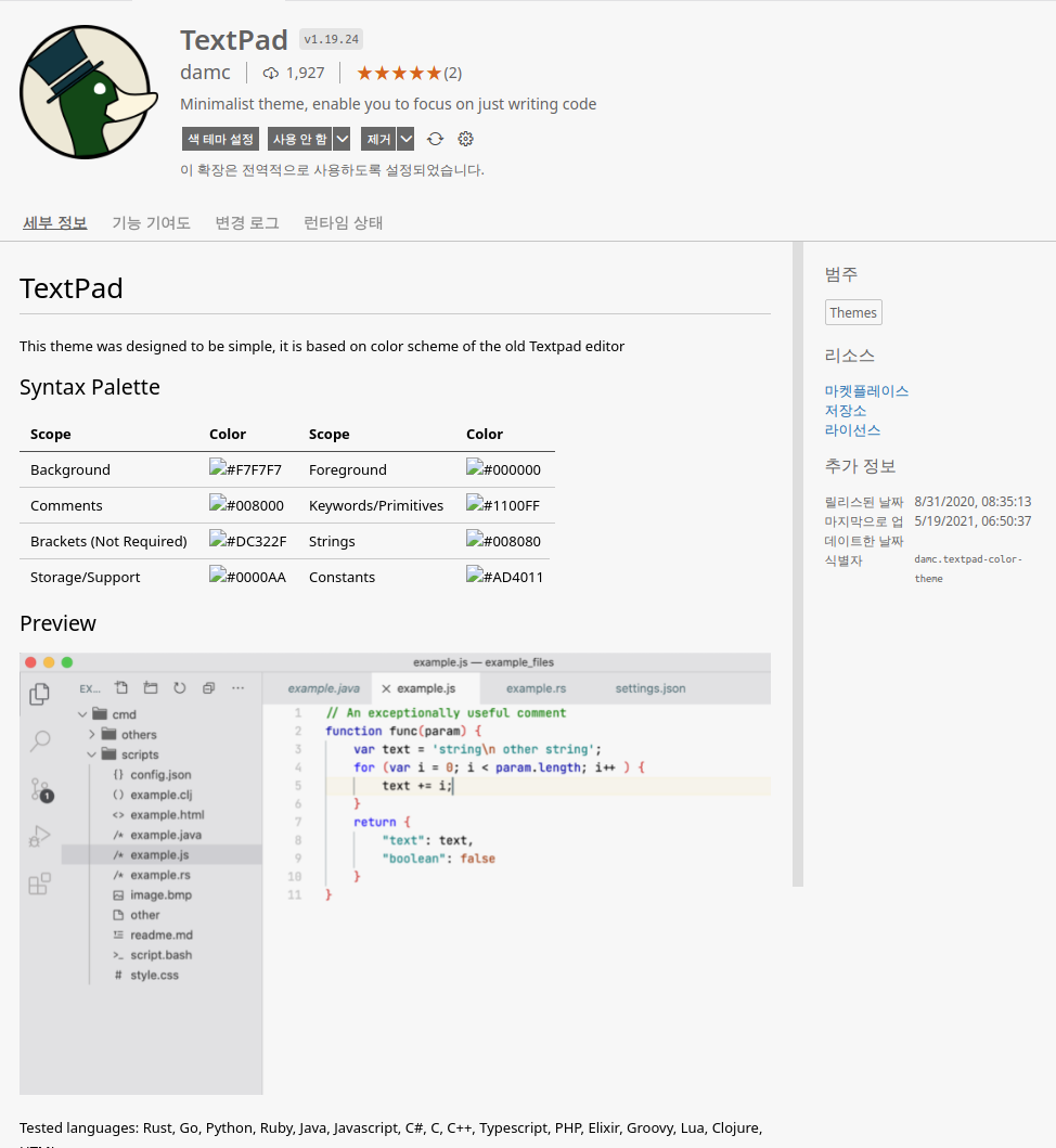 "TextPad"라는 녀석인데 색상이 단순하고 눈에 피로가 적은 구성을 가지고 있다. 여러모로 과한 색감이 불편한 분들에게 추천할만하다.